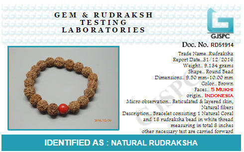 Arihant Gems and Jewels 5 Mukhi/Faced Indonesia Rudraksh Bracelet with "Coral"| Natural & Certified | Astrological Gemstone | Positive Effect | Unisex Both for Men & Women
