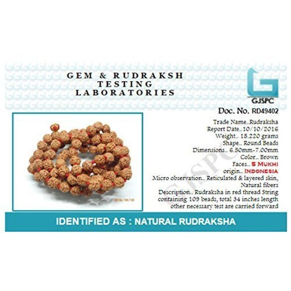5 Mukhi RUDRAKSHA JAAP MALA FOR POOJA (ASTROLOGY) (108+1 Beads) 100% Original & Certified By ARIHANT GEMS & JEWELS .